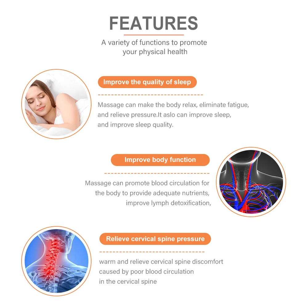 6 Massage nodes:This shoulder massager comes with 6 nodes, which provide massages on your neck, shoulders, upper back, lower back, waist, foot, calves, legs, feet and arms - helping your full body parts to release stress.