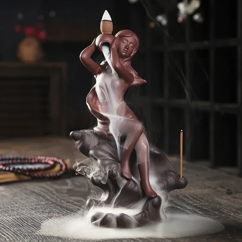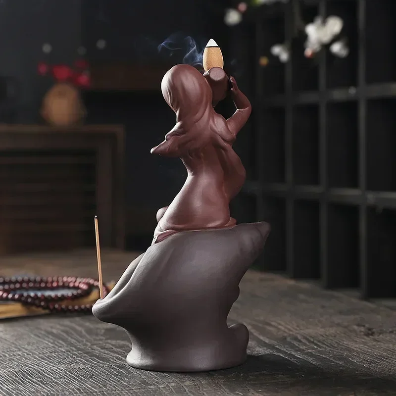 Home Ornaments Mermaid Ceramic Handicrafts Conch Girl Backflow Incense Burner Stick Holder Purple Clay Censer Decor -No Incense