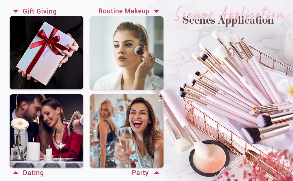 20pcs in 1 brush set contains brushes of powder, foundation, blush, highlighter, contour, concealer, eyeshadow, eyebrow, and blending, meeting all your makeup needs on any occasion and of various makeup styles.