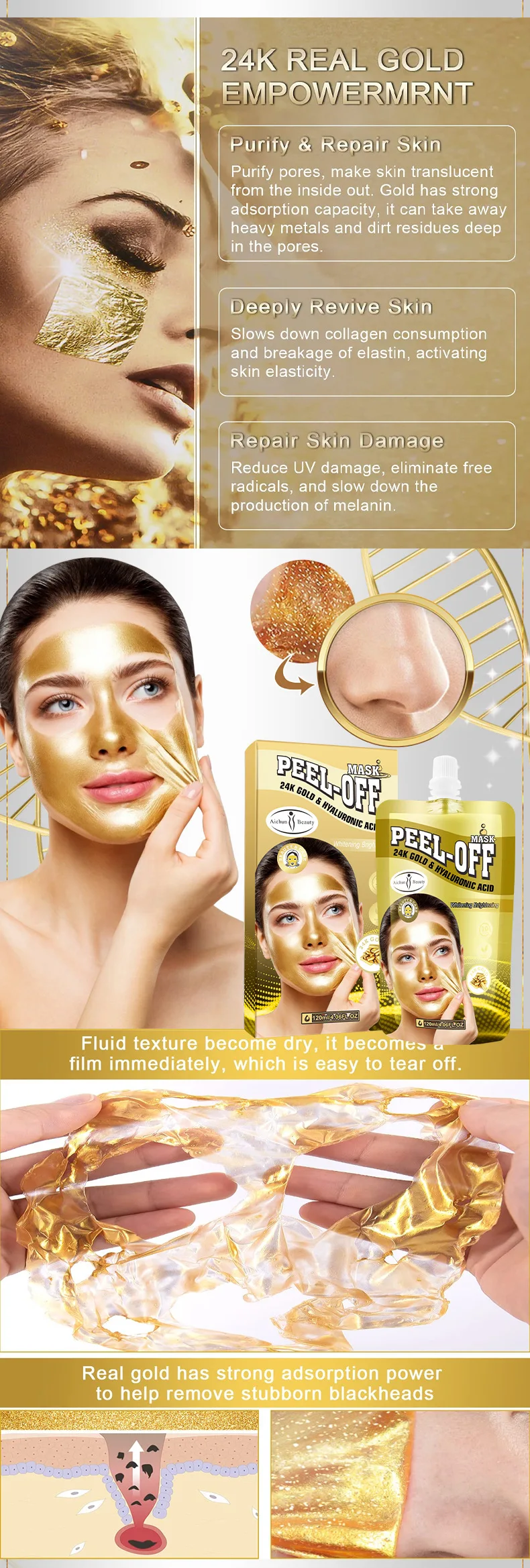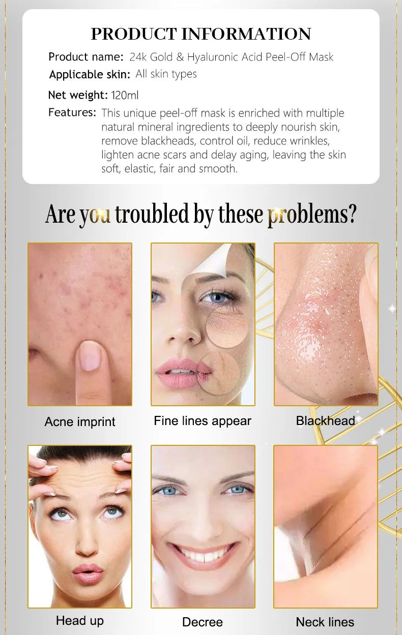 Gold Hyaluronic Acid Tearing Mask Peel-off Masks Blackhead Remove Acne treatment Anti-wrinkle Moisturizing Peeling Face Mask