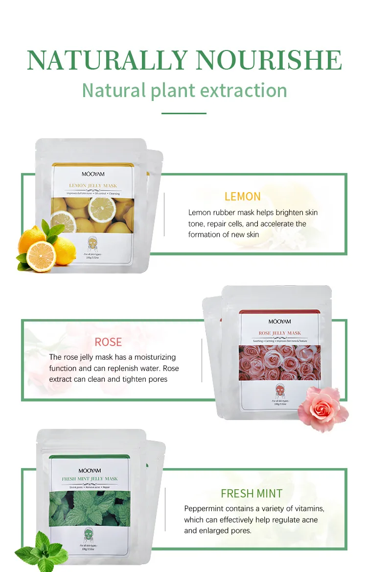 This hydrogel mask powder consists of various plant extracts with amino acids,minerals, vitamin active factors and so on.